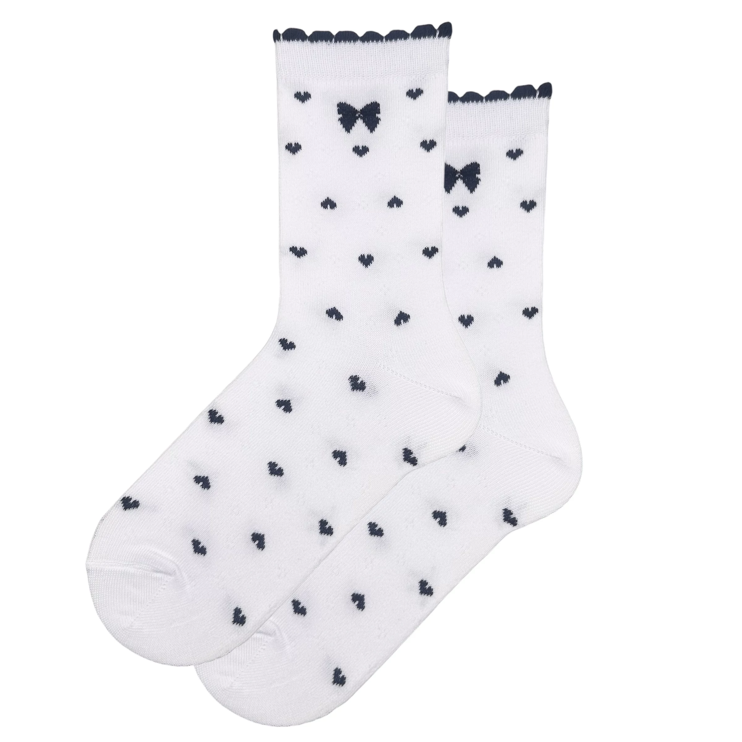Női bokazokni fehér csipke alapú - sötétkék szíves masni