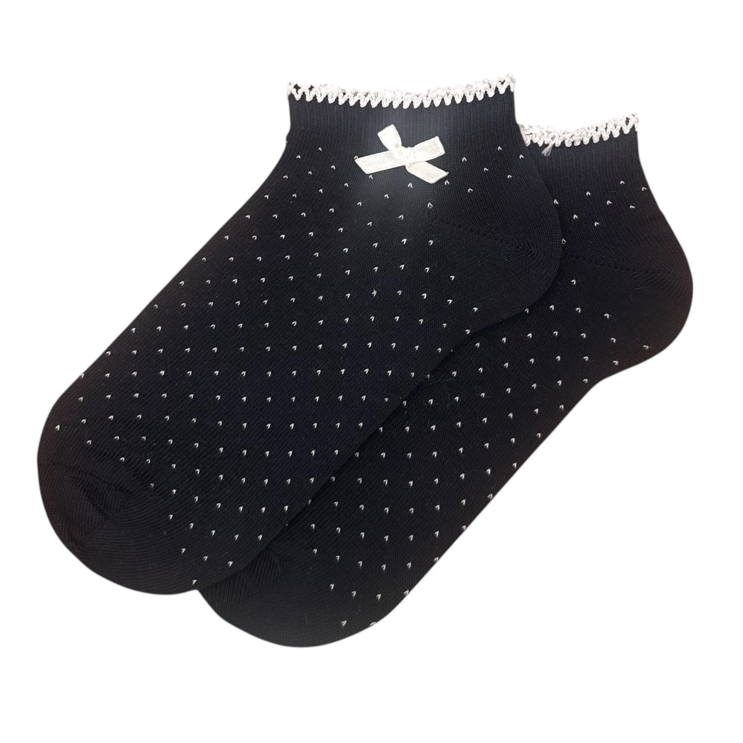 Női titokzokni fehér alapon tűpötty - horgolt - rávarrt masni